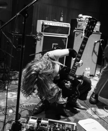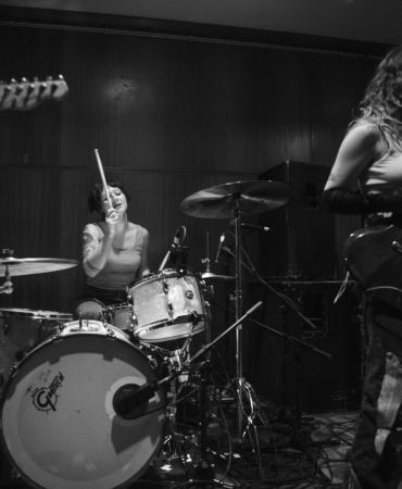Schrobilgen’s sapphic machismo was ablaze Wednesday night in front of the First Unitarian crowd, as she jumped off the stage with her microphone straight into the middle of the mosh pit and later climbed up onto a speaker stack screaming her lungs out. Meanwhile, Livingston steadily stared out to the crowd with a harlequin smile or balanced her bass on the palm of her hand.