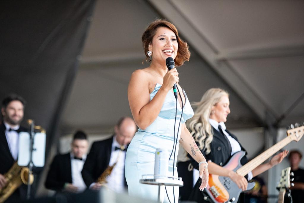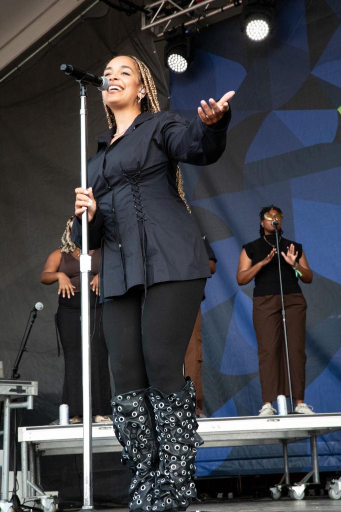 Karlia, a neo-soul inspired singer-songwriter from Philly, attended her second Newport Jazz Fest this year, and said she looks forward to the variety. “You can see some of the jazz OGs, some current and popular artists, and then the up and coming as well,” she says, adding that so much of the crowd being present and in the moment at Newport is a relief from the constant online nature of daily life. “I think it’s really important, especially as an artist in this era of music that’s very social media driven, that we’re reminded that there are these communities of artists and listeners that are here to really enjoy and celebrate the music.”