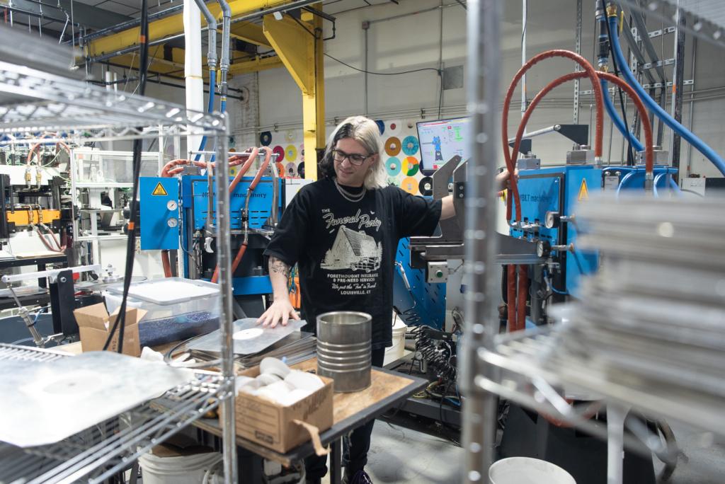 Barreras remembers the move from Nottingham to Coatesville earlier this year. Studio 4 went from approximately 4,000 square feet to 20,000 square feet. The pressing staff consists of eight people on rotating schedules. In total, fewer than 20 people run Studio 4 Vinyl day in and day out — including delivering 55-pound bags of plastic pellets and shipping out boxes of records.