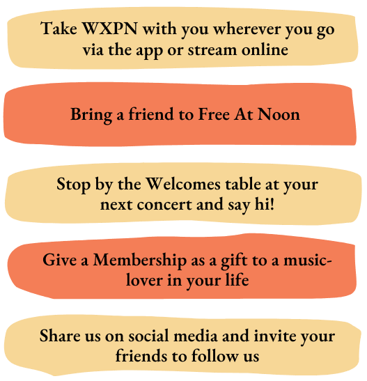As a WXPN Member, you’re an ambassador of the station and our best resource for getting new community members. Our goal is to get new people to learn about WXPN! We’d love your help spreading the word! Even if you’re not a member, but you love WXPN, consider telling your friends about us! Some simple things you can do to share WXPN with others are: